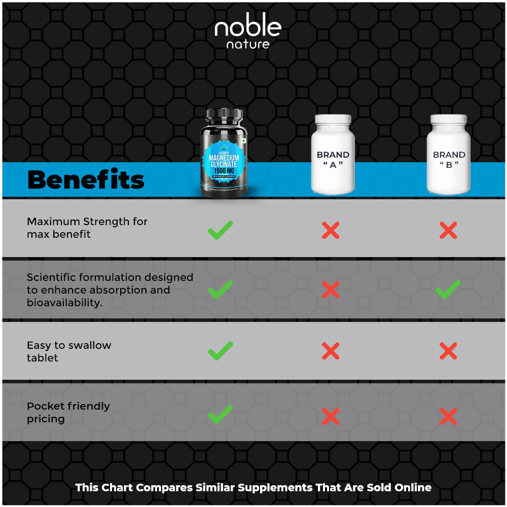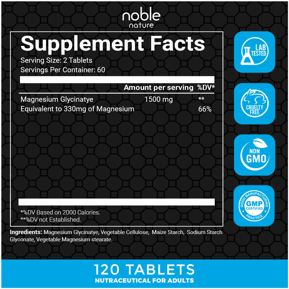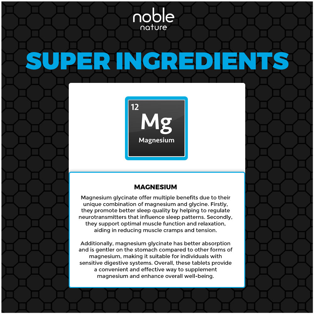 - قم بتغذية جسمك وعقلك باستخدام جليسينات المغنيسيوم من نوبل نيتشر - وهو شكل لطيف من المغنيسيوم سهل الامتصاص مصمم لدعم الاسترخاء ووظيفة العضلات والنوم المريح دون إزعاج الجهاز الهضمي.