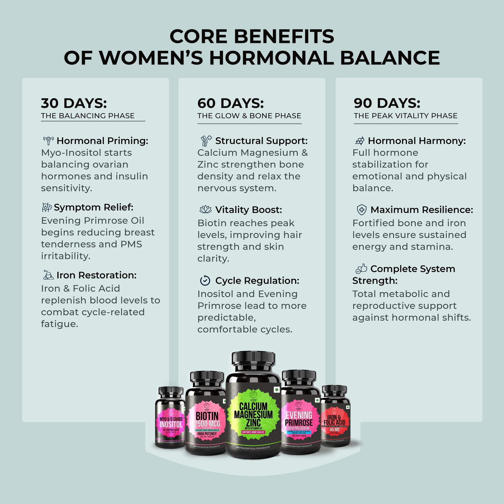 Instead of guessing what your body needs, this structured combination supports hormonal rhythm, nutrient replenishment, and overall female wellness — all in one complete routine.